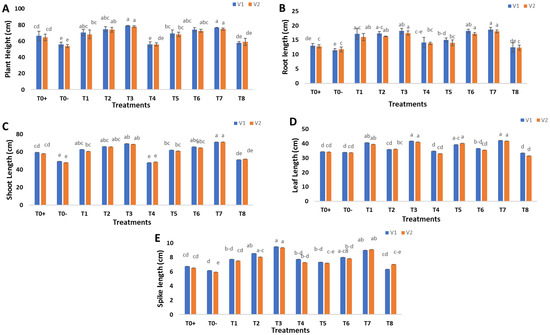 Effect of foliar applications of green synthesized SeNPs and CeONPs on morphological parameters of wheat plant under the stress of stripe rust disease. To+ represent the control, To− represents the effect of pathogen only, T1 to T4 (i.e., 10, 20, 30, 40 mg/L) represents the effect of green synthesized SeNPs, T5 to T8 (i.e., 10, 20, 30, 40 mg/L) represents the effect of green synthesized CeONPs (A) Plant height in response of green synthesized SeNPs and CeONPs (B) Root length in response of green synthesized SeNPs and CeONPs. (C) Shoot length in response of green synthesized SeNPs and CeONPs. (D) Leaf length in response of green synthesized SeNPs and CeONPs. (E) Spike length in response of green synthesized SeNPs and CeONPs. (Mean ± SE; n = 3). Different small letters on bars represent statistically significant variation at p < 0.05 as per DMRT.