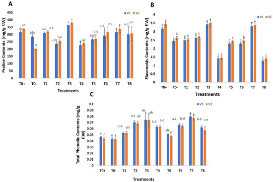 The effects of foliar application of green synthesized SeNPs and CeONPs on biochemical parameters were recorded in terms of proline, phenolics and flavonoids. The proline, phenolics and flavonoid contents were analyzed in untreated diseased plants and treated with different concentrations of SeNPs and CeONPs. The biochemical parameters were enhanced by the foliar applications of green synthesized SeNPs and CeONPs. The most significant results were obtained at 30 mg/L of both SeNPs and CeONPs, which most enhanced the proline, phenolic and flavonoid contents (Figure 8A–C).