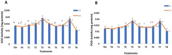 The overall result reported that antioxidant enzymes, such as superoxide dismutase (SOD) and peroxidase (POD), increased in both wheat varieties under disease stress by foliar application of SeNPs and CeONPs. In the positive and negative control, SOD and POD were detected at low levels. The most significant results were obtained at 30 mg/L of both SeNPs and CeONPs, which most enhanced the SOD and POD (Figure 9A,B). Antioxidant enzymes and molecular chaperones are important proteins that play essential roles in protective mechanisms [70]. One of the protective mechanisms of the enzymatic antioxidant system is the enzyme SOD, which is found in various areas of the cell. The dismutation of superoxide radicals into hydrogen peroxide and oxygen is catalyzed by SOD. Since plant superoxide dismutase (SOD) catalyzes the removal of the free radical O2, a decrease in the activity of SOD leads to an accumulation of the free radical O2 in leaves [71].