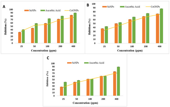 The antioxidant activity of SeNPs and CeONPs was measured using the DPPH and ABTS and reducing power assays. The SeNPs and CeONPs showed strong DPPH, ABTS and reducing power radical scavenging activity, which was dose-dependent (Figure 10A–C). This indicated that the antioxidant activity was proportional to the concentration of SeNPs and CeONPs. Both SeNPs and CeONPs showed a significant increase at 400 ppm. SeNPs had a DPPH value of 83.33 percent, an ABT value of 74.84 percent and reducing power value of 75.24 percent, while CeONPs had a DPPH value of 76.66 percent, an ABT value of 73.36 percent and reducing power value of 70.6 percent. The standard values were reported as 90 percent DPPH value and 87.84 percent ABT value. Our results were similar when compared with previous reports on green synthesized SeNPs. Kokila et al. [33] recently discovered that green synthesized SeNPs, with a size of 16 nm, had an EC50 value of 22.5 g/m. Different concentrations of SeNPs and CeONPs (50, 100, 150, 200, and 400 ppm) were used to test the effectiveness of the reducing power. The reducing power was enhanced by increasing the concentrations of both NPs. Both NPs functioned effectively at 400 ppm, with 75.24 percent of SeNPs and 70.63 percent of CeONPs showing a reducing effect. Cao et al. [74] investigated the reducing effect of SeNPs and found similar results. Small SeNPs exhibited a large specific surface area, which allowed many reactive sites for free radicals. As a result, ultrasonic cavitation contributed to the ability to scavenge free radicals in the study by Khai et al. [75]. In addition, Khai et al. [76], reported that SeNPs had a positive effect on free radical scavenging activity.