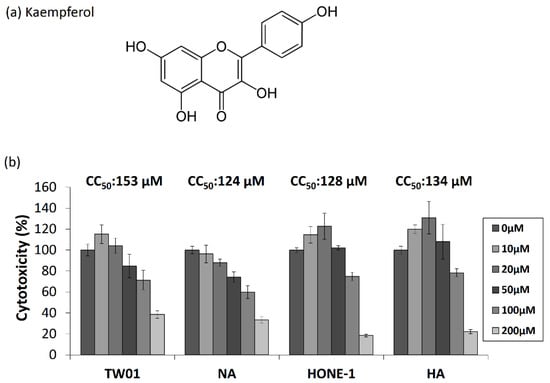 Flavonoids are natural polyphenolic compounds that is abundant in tea, vegetables (e.g., kale, celery, cabbage, broccoli, and beans), fruits (e.g., grapes, tomatoes, strawberries, apples, and citrus), and medicinal plants (e.g., Ginkgo spp., Equisetum spp., and Euphorbia spp.). Kaempferol (KP, 3,4′, 5,7-tetrahydroxyflavone) is a flavonol-type flavonoid known for its antioxidant activity. Kaempferol has various biological functions, including anticancer, antioxidant, anti-inflammatory, antimicrobial, and antimutagenic activities [1,2]. It has also been found to protect the vascular, nerve, and cardiovascular systems and prevents liver fibrosis and injury [3,4]. The antiviral effect of kaempferol compared to other flavonoids, such as that of quercetin and apigenin, has not been well investigated. In the past decade, several researchers have analyzed extracts from natural plants for anti-viral activity and found that kaempferol displays potent ability against hepatitis B virus (HBV) [5,6], hepatitis C virus (HCV) [7], herpes simplex virus-1(HSV-1) [8], and poliovirus [9]. By examining kaempferol compounds, several studies have identified their broad antiviral activity against influenza virus [10], cytomegalovirus (CMV) [11], enterovirus 71 [12] and SARS-CoV [13]. Although many positive results have been documented, some studies have shown contradictory results, revealing that kaempferol may have fewer effects in blocking HSV [14], Japanese encephalitis virus (JEV) and dengue virus (DENV) [15]. Nevertheless, the antiviral activity of kaempferol warrants further investigation.