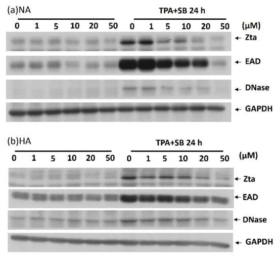 Kaempferol, 12-O-tetradecanoyl-phorbol-1,3-acetate (TPA) and sodium butyrate (SB) were purchased from Sigma-Aldrich Co. EBV antibodies anti-Zta 4F10 [63], anti-BMRF1 (EAD) 88A9 [63], and anti-DNase 311H [64] were produced in our laboratory. The anti-β-actin and anti-GAPDH antibodies were purchased from Sigma-Aldrich Co., St. Louis, MO, USA).