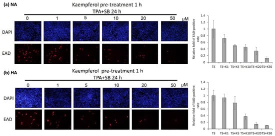Kaempferol treatment decreased the number of EAD-positive cells. (a) NA and (b) HA cell lines were prepared for immunofluorescence analysis. To determine the inhibition of EBV reactivation by kaempferol, the cells were pre-treated for 1 h. TPA and SB were added to induce EBV reactivation. After 24 h of treatment, the cells were treated with EAD antibody and analyzed by fluorescence microscopy. The statistical results are shown as relative folds in the left panels of the figures. The values of each sample were derived from three independent trials. TS: TPA + SB; K1, K5, K10, K20 and K50: 1, 5, 10, 20 and 50 μM kaempferol.