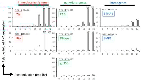 To demonstrate this phenomenon further, we designed a time-course analysis to monitor the reduction in lytic gene expression caused by kaempferol. NA cells were seeded in 6-well plates for 24 h. For the control group, TPA plus SB was added to induce EBV infection for 24 h. For the kaempferol-treated group, cells were harvested at the indicated time points for RT-qPCR analysis. Several EBV lytic genes, Zta, Rta, EAD, DNase, and gp350, were detected for their RNA expression. As shown in Figure 4, the immediate-early genes Zta and Rta were first expressed 9–12 h after TPA plus SB treatment, followed by EAD and DNase expression at 12–15 h post-induction. EBV late gene gp350 remained almost silent during the first 24 h of EBV reactivation, which is consistent with general knowledge about the EBV life cycle. In the group treated with kaempferol, all EBV lytic genes were significantly shut down, revealing that kaempferol is an effective inhibitor of EBV activation (Figure 4). Interestingly, for latent gene expression, EBNA1 and LMP1 expression increased concomitantly during EBV reactivation, similar to our previous studies. However, kaempferol treatment was less effective against EBNA1 and LMP1 (Figure 4). These results suggest that kaempferol represses the EBV lytic cycle during the initial stage.