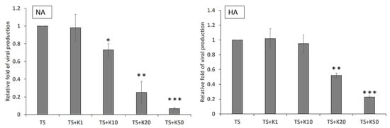 Kaempferol treatment inhibits EBV viral production in NPC cell lines. NA and HA cell lines were pre-treated with kaempferol and induced with TPA + SB for 48 h. The supernatant of each sample was treated with DNase I to remove free DNA from the virus and was subsequently treated with proteinase K to digest viral capsids. The resultant samples were subjected to qPCR analysis to detect the EBV BALF5 fragment. The values of each sample were derived from three independent trials. The relative fold of viral production is presented as a companion with the value of each sample relative to that of the TS group. (* p < 0.05, ** p < 0.01, *** p < 0.001) TS: TPA + SB; K1, K10, K20 and K50: 1, 10, 20 and 50 μM kaempferol.