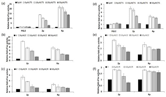 Kaempferol treatment inhibits Zp and Rp activities in NPC cell lines. The effects of kaempferol on Zp and Rp were determined using luciferase assay. NA (a–c) and TW01 (d–f) cells were transfected with Zp or Rp reporters for 3 h, followed by kaempferol pre-treatment and TPA + SB induction for a further 24 h. Cell lysates were collected to measure luciferase activity of each sample. The values of each sample were derived from three independent trials. The relative fold of luc activity was represented as the relative fold of luciferase activity compared to mock control. TS: TPA + SB; V: vector control; Z: Zta-expressing plasmid; R:Rta-expressing plasmid.