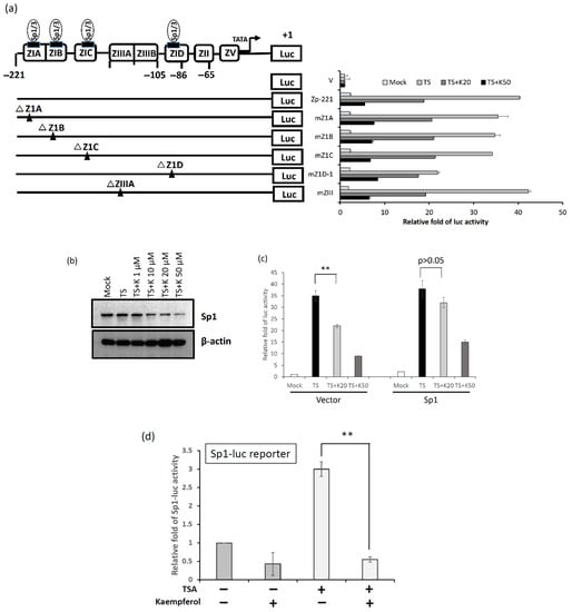 Sp1 has been identified as a critical factor that triggers EBV reactivation. In addition, Zta is the first protein expressed during EBV lytic initiation. Several Sp1 binding sites were identified within the Z1A, Z1B, Z1C, and Z1D domains of Zp, as shown in Figure 7a. A panel of reporter plasmids containing 3-bp mutations in the aforementioned domains was constructed to detect luciferase activity after kaempferol treatment in NA cells. The results showed that for the wild-type reporter Zp-221, kaempferol suppressed chemical-induced luciferase activity in a dose-dependent manner (Figure 7a). Moreover, the similar inhibitory tendency on kaempferol were shown for mZ1A, mZ1B, mZ1C and mZIII, but not for mZ1D-1, which the inhibitory effect was almost compensated in the treatment group of TPA + SB and 20 μM kaempferol (TS + K20) (Figure 7a, bottom panel).