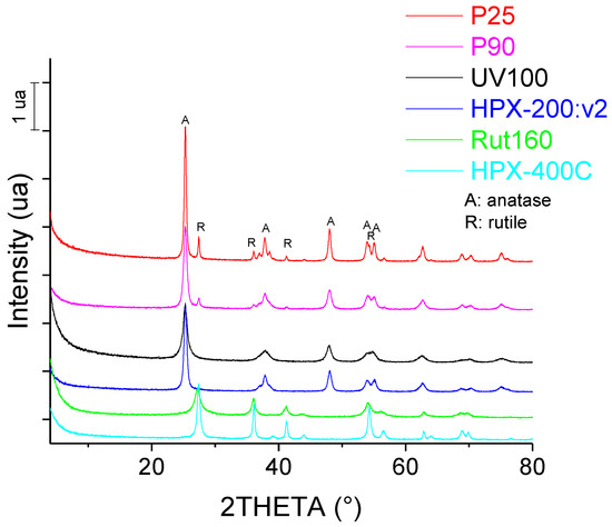 The XRD patterns of the six commercial TiO2 catalysts are shown in Figure 1. It is confirmed that P25 and P90 are mixtures of anatase and rutile crystalline phases, UV100 and HPX-200/v2 are pure anatase and Rut160 and HPX-400C are pure rutile. From XRD measurements, the average size of TiO2 crystallites was found to be around 8 nm for UV100 and Rut160, ~12 nm for P90 and HPX-200/v2, 16 nm for HPX-400C and around 20 nm for P25 (Table 1). The crystallite size of UV100 and P25 were in agreement with those determined by Arana et al. [32].