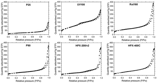 The isotherms shown in Figure 2 present the same feature, the presence of a hysteresis loop at high relative pressure, linked with the presence of large mesopores, above 3–5 nm. UV100 and Rut160 present also micropores as indicated by the significant N2 adsorption at very low relative pressure. As shown in Table 1, the highest BET surface areas were observed for UV100 (300 m2.g−1) and Rut160 (175 m2.g−1), probably due to their smallest crystallites and the presence of micropores. The P25 showed the lowest surface area (55 m2.g−1), whereas the rest of the samples, i.e., P90 (mixture of anatase and rutile), HPX-200/v2 (anatase) and HPX-400C (rutile), exhibited almost similar surface areas close to 100 m2.g−1.