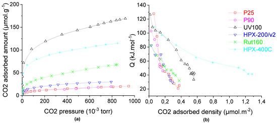 Carbon dioxide adsorption on TiO2 (a) isotherms and (b) calorimetric curves. Conditions: TiO2 samples pre-treated at 150 °C under secondary vacuum for 5 h, CO2 adsorption at 30 °C.