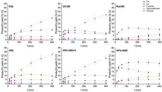 Products’ yield time course in the presence of the six TiO2s. Conditions: T = 90 °C, Pair = 1 atm, Vwater = 200 mL, (DHA) = 0.1 mol.L−1, (TiO2) =10 g.L−1.