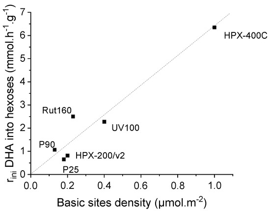 In the presence of the most active catalysts, HPX-400C, Rut160 and UV100, the formation of fructose appears as a main initial pathway in the transformation of DHA in addition to PA formation. However, whereas fructose is the main primary product in the presence of Rut160, fructose and PA are two primary products formed in equivalent amount in the presence of HPX-400C, and the formation of PA is initially slightly favoured with respect to fructose in the presence of UV100. In the presence of all the other TiO2 (HPX-200/v2, P25 and P90), the initial formation of PA and its further conversion into LA is the main pathway. With the reaction progress over the first three catalysts, the fructose yield declines and we can observe a parallel increase of the glucose formation, explained by the base catalyzed fructose–glucose isomerization. The initial formation of fructose well agreed with the observed link between the TiO2 samples’ activity and the basicity of their surface. Indeed, fructose, which is C6 sugar, can be formed by aldolic condensation of the trioses DHA and glyceraldehyde, easily formed by DHA isomerization. Note that glyceraldehyde is detected as minor product. Both reactions, aldolic condensation and the aldo-ketose isomerization, responsible for fructose–glucose and DHA–glyceraldehyde isomerization, are base catalyzed steps [36,37]. Accordingly, a linear increase of initial rates of hexoses formation with the basic sites densities can be drawn (Figure 8). Apparently, the presence of micropores in Rut160 does not interfere with the trioses condensation reaction.