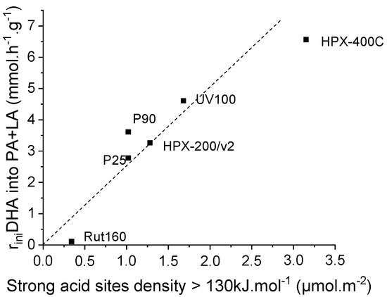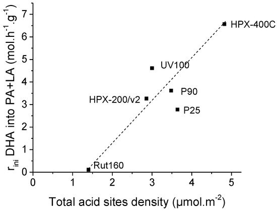 From the TiO2 activity ranking demonstrated in Figure 6 and the acid-base properties summarized in Table 2, the correlation with the basicity is highlighted: the TiO2 samples with the lowest acid/basic sites balance, i.e., HPX-400C, Rut160 and UV100, are the most active. Moreover, one can conclude for the absence of any correlation with acidity. Indeed, we searched possible correlations between the initial rate of DHA conversion and the total amount of acid sites (µmol.g−1) or the total acid sites densities (µmol.m−2) in order to take into account the variability of the samples’ surfaces, but no link was observed between the initial rate of DHA conversion and the original acidity of the samples determined in the gas phase (Figures S1 and S2).
