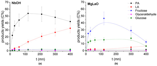 Evolution of the Products’ yields with the reaction time in the presence of (a) NbOH and (b) MgLaO. Conditions: T = 90 °C, Pair = 1 atm, Vwater = 200 mL, (DHA) = 0.1 mol.L−1, (catalyst) = 10 g.L−1.