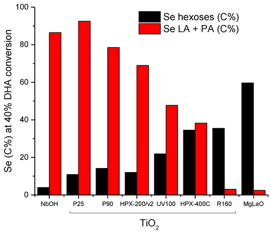 Finally, we plotted hexoses selectivities and the sum of PA and LA selectivities at an equivalent DHA conversion level (40%) in Figure 13. The progressive increase of hexoses selectivities against the progressive decrease of PA + LA selectivities is observed. This opposite behavior appears to be roughly linked to the original acid/base balance measured on the TiO2 samples. The rutile TiO2, characterized by the lowest acid/base balance (Table 2), was the most selective for hexoses formation among the TiO2 samples with a behavior close to that of the reference basic catalyst MgLaO. On the other hand, P25 with the highest acid/base balance was the most selective for PA and LA formation close to the selectivity observed over NbOH, the reference acid catalyst.