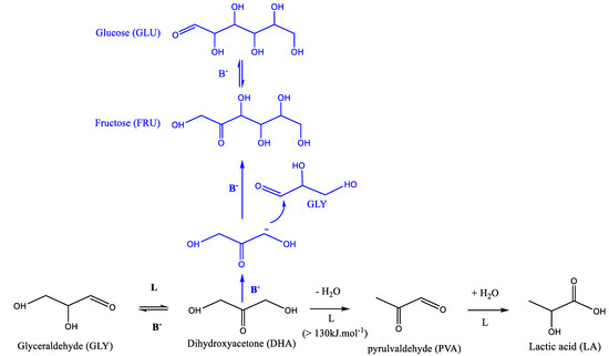 (2) Disagreeing with most of the previous literature, this could also indicate that DHA dehydration–isomerization into pyruvaldehyde and lactic acid could proceed via a bimolecular mechanism with the intermediate formation of dimeric intermediates as suggested in a recent paper [23].