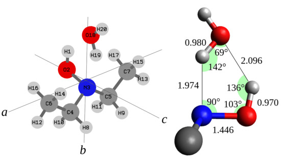 Here we want to focus on a different kind of compound, where the hydroxyl group is directly bound to a heteroatom, making it possible to observe a 5-member ring structure. Indeed this arrangement has been observed in the water–hydroperoxy radical complex, whose structure is nearly planar [24]. It is worth noting that the calculated and experimental data provide different positions for the hydrogen atom of water not involved in the ring: out of, or in, plane, respectively. Other promising candidates able to bind water forming a 5-member ring are the hydroxylamine derivatives. To our knowledge, no rotational spectroscopy information is available about the interaction of water with the N-O-H functional group in the isolated phase. Therefore, we decided to study the monohydrate complex of N,N-diethylhydroxylamine (DEHA). DEHA is a hydroxylamine derivative where two ethyl chains replace the amino hydrogen atoms. Because of its volatility, low toxicity, and scavenger activity, it is used in the treatment of water [25,26]. Its properties in the isolated phase have been recently investigated by a mix of theoretical and spectroscopic techniques [27]. It has been found that twelve possible conformers exist depending on the orientation of the hydroxyl and ethyl groups. Using rotational spectroscopy, it has been proved that the most stable form corresponds to an overall trans arrangement of the alkyl chain and the hydroxyl eclipsing the nitrogen lone pair. This structure is well suited to provide both a proton donor (hydroxyl) and a proton acceptor (amine) site in the right orientation to bind a water molecule and create a 5-member ring structure (Figure 1). In the following, we report on the rotational spectrum of the 1:1 water complex of DEHA (DEHA-W) observed by pulsed jet Fourier transform microwave (PJ-FTMW) spectroscopy in the 6.5-18.5 GHz frequency range and the quantum mechanical investigation of its properties.