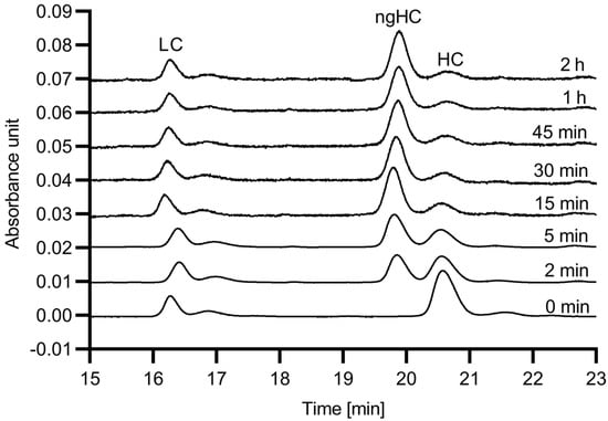 SDS-CGE analysis of the hIgG1 sample with different 6His-PNGase F digestion times at 37 °C. Peaks: LC: light chain, ngHC: non glycosylated heavy chain, HC: heavy chain. Conditions: 30 cm total (20 cm effective) length, 50 µm ID bare fused silica capillary with SDS-MW gel buffer. Applied electric potential: 15 kV (reverse polarity mode); temperature: 25 °C; injection: 5 kV/20 s.
