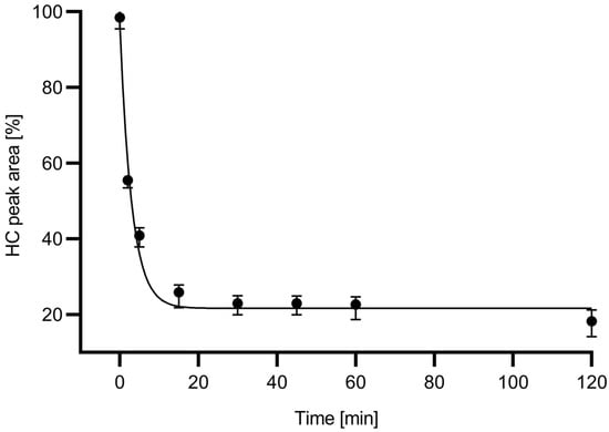 Based the deglycosylation time plot in Figure 2, a 15 min digestion time was chosen for all downstream experiments because during this time frame, apparently close to maximum release rate was already achieved. The relative ngHC peak area % was calculated as depicted by Equation (3) and used accordingly in all further calculations.