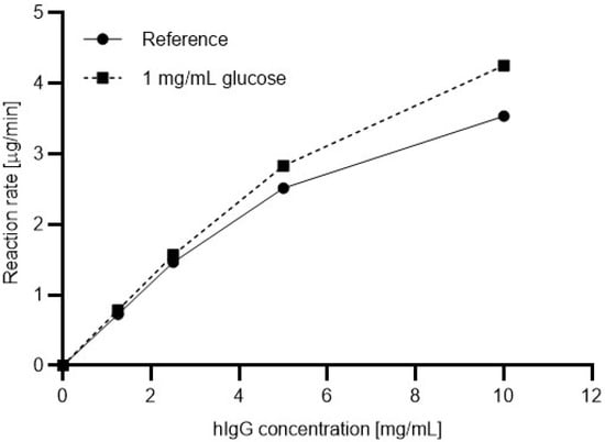 As one can observe, with increasing substrate concentration, the reaction rate increased in a higher degree with the presence of glucose in the reaction mixture. Apparently, with 10 mg/mL hIgG1 substrate concentration, the addition of 1 mg/mL glucose resulted in a 16.8% improvement in the reaction rate. Therefore, glucose should be considered as an activator for the 6His-PNGase F enzyme.