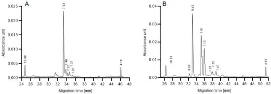 Capillary isoelectric focusing analysis of the in-house produced 6His-tagged (A) and a commercial (B) PNGase F enzymes. Numbers above the peaks represent the corresponding pI values. Separation conditions: 20 cm effective capillary length (30 cm total length, 50 µM ID, NHCO coating); applied focusing and mobilization electric field strengths were 25 kV and 30 kV, respectively. pI markers: 4.1 and 10.0. Separation temperature: 20 °C. The sample was mixed into the Master Mixture and introduced by applying 25 psi for 99 s, i.e., to completely fill the separation capillary.