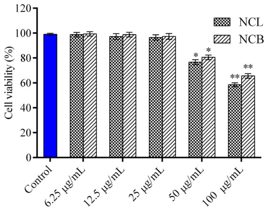 Effect of N. caudatum leaf and bark essential oils on cell viability. RAW 264.7 cells were treated with various concentrations of N. caudatum leaf and bark essential oils (6.25–100 µg/mL) for 24 h. The total number of viable cells was determined by methyl thiazolyl tetrazolium (MTT) assay. Data are expressed as mean ± SD (n = 3). The blue bar represents the control group corresponding to untreated cells. Statistical significance was measured by one-way analysis of variance followed by Tukey test. * p < 0.05 and ** p < 0.01 between the control and different concentrations of N. caudatum essential oils.
