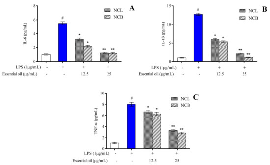 Effect of N. caudatum leaf and bark essential oils (12.5 and 25 µg/mL) on LPS-induced proinflammatory cytokine production in RAW 264.7 cells. Cells were treated with N. caudatum leaf and bark essential oils (12.5 and 25 µg/mL), followed by 1 μg/mL of LPS for 24 h. After incubation, cell-free supernatants were harvested for estimation of (A) interleukin 6 (IL-6), (B) interleukin-1β (IL-1β) and (C) tumor necrosis factor alpha (TNF-α) via ELISA. Data are expressed as mean ± SD (n = 3). The white bar represents the control group corresponding to untreated cells and the blue bar represents cells treated with LPS (1 µg/mL). Statistical significance was measured by one-way analysis of variance followed by Tukey test. # p < 0.05 between the control and LPS-treated cells; * p < 0.05 and ** p < 0.01 between the cells treated with LPS alone (1 µg/mL) and those treated with N. caudatum essential oils and LPS.