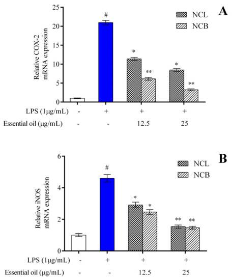 The mRNA expression levels of iNOS and COX-2 in RAW 264.7 cells were estimated by quantitative real-time PCR (qRT-PCR) according to the protocol reported by Syam et al. [96]. The RAW 264.7 cells were plated in a culture dish at a density of 1 × 105 cells/mL and incubated until they reached confluency. The culture medium was then replaced with serum-free medium containing varying concentrations of NCB and NCL essential oil and LPS. Then, the plate was cultivated for another 24 h under the same conditions.