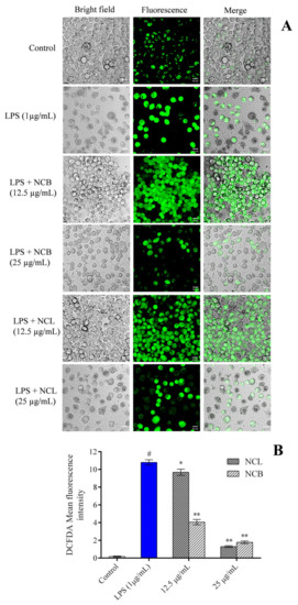 In the current investigation, the amount of ROS expression in RAW 264.7 cells was determined using an oxidation-sensitive probe i.e., 2′, 7′-dichlorodihydrofluorescein diacetates (DCFH-DA), to determine whether N. caudatum essential oil had an effect on ROS accumulation. Fluorescence microscopic images and fluorescence intensity measurements revealed that increased ROS accumulation by LPS was attenuated by pretreatment of the RAW 264.7 cells with NCB and NCL essential oils at a dose of 25 µg/mL (Figure 5). However, pretreatment with NCL and NCB essential oils at a dose of 25 µg/mL significantly reduced the intracellular ROS by 90.90% (11-fold) and 87.95% (8.3-fold), respectively, as compared to the LPS-treated group. The intracellular level of ROS in LPS-induced RAW 264.7 cells was dramatically reduced after treatment with N. caudatum essential oil. The reduced NF-κB activity and enhanced mitochondrial membrane potential could explain the reduced levels of ROS in RAW 264.7 cells treated with N. caudatum essential oil.
