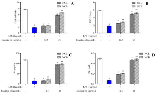 RAW 264.7 cells were incubated with various concentrations of NCB and NCL essential oil and LPS (1 µg/mL) for 24 h. The harvested cells were lysed and centrifuged to obtain a cell lysate. Various endogenous enzymes, such as GSH, CAT, SOD and GPx, were estimated from the cellular lysate according to the supplier’s protocol (Oxis Research, Portland, USA). The results of GSH are expressed as µM, SOD as U/mg, and GPx and CAT as ng/mL protein and mU/mL, respectively.