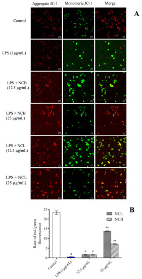 Increased reactive oxygen species destroy the mitochondrial membrane integrity when RAW 264.7 cells are induced with LPS. In order to analyze the effect of N. caudatum essential oil on LPS-induced mitochondrial damage, we treated RAW 264.7 cells with the mitochondrial specific probe JC-1 and visualized them under a fluorescent microscope (Figure 7). When the membrane potential was normal, JC-1 fluoresced red, and when the membrane potential was disrupted, it fluoresced green. This loss of membrane potential was significantly restored by treatment with N. caudatum essential oil at concentrations of 12.5 and 25 μg/mL.