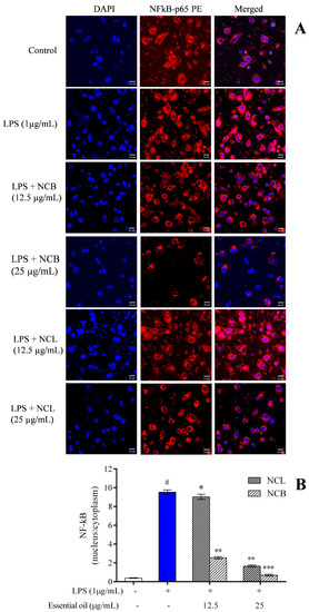 The NF-κB transcription factor is involved in various cellular processes, such as proliferation, cell death and immunological responses. NF-κB is generally sequestered in the cytoplasm by an inhibitory protein class known as the inhibitor of κB (IκB) [87]. NF-κB is a heterodimer complex consisting of p65 and p50 subunits. NF-κB, together with its inhibitory protein, IκBκ, is found in the cytoplasm. Following LPS stimulation, NF-κB is liberated from its inhibitory protein, IκBκ, which is then phosphorylated, ubiquitinated and degraded by the proteasome. Then, NF-κB is translocated to the nucleus, thereby promoting the expression of inflammatory genes and cytokines/mediators [88,89]. To assess the role of N. caudatum essential oil in inhibiting the nuclear translocation of NF-κB from cytoplasm, RAW 264.7 cells were exposed to N. caudatum essential oil for 24 h, followed by treatment with LPS. Confocal microscopy was used to examine the translocation of NF-κB p65 to the nucleus (Figure 8). After treatment, the RAW 264.7 cells were immunostained against the NF-κB p65 antibody and incubated for 12 h. The nucleus was stained with a fluorescent stain (Hoechst 33342) and FITC-conjugated secondary antibody. LPS stimulation increased NF-κB p65 levels in the nucleus, whereas pretreatment of the cells with NCB essential oil at doses of 12.5 and 25 μg/mL inhibited the nuclear translocation of NF-κB by 72.97% (3.7-fold) and 92.31% (13-fold), respectively, as compared to LPS-treated cells. Based on experiments on the effect of Cinnamomum subavenium essential oil using a carrageenan-induced hind mouse paw oedema model [37], it was established that NF-𝜅Bp65, a signal for NF-𝜅B activation, played an important role in the regulation of its transcriptional capacity, and the essential oil suppressed the nuclear translocation of NF-𝜅Bp65 in a concentration-dependent manner.