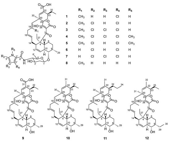 During the isolation of compounds 7–12, six known spirotetronate polyketides, including decatromicin A–B (1–2), BE-45722B–D (3–5), and pyrrolosporin A (6) were also isolated and identified. Decatromicins A (1) and B (2) were initially discovered from Actinomadura sp. MK73-NF4 and showed potent antimicrobial activity against Gram-positive methicillin-resistant Staphylococcus aureus (MRSA) [14,15], while BE-45722 series of compounds (3–5) were analogs of the decatromicins with an altered decoration of chlorine on their pyrrole group [16,17]. Compounds 3–5 were also reported to demonstrate antibacterial activity against a panel of Gram-positive bacteria, including Bacillus cereus, Bacillus subtilis, S. aureus, and Clostridium perfringens. Another congener, pyrrolosporin A (6), was first isolated from Micromonospora sp. (ATCC 53791) [19,20]. The main structural difference between pyrrolosporin A (6) and decatromicins/BE-45722 series was the absence of a methyl group attached to an olefin in the aglycone core in 6.
