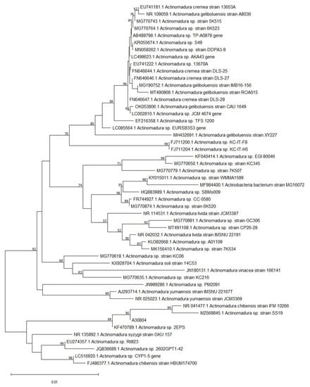 The DNA of bacterial strain A30804 was extracted from the plate using the DNeasy PowerSoil Pro Kit (Qiagen, Hilden, Germany) according to the manufacturer’s protocol. Upon extraction, DNA purity and yield of A30804 was measured with NanoDrop2000 spectroscopy system (ThermoFisher Scientific, Waltham, MA, USA). Bacterial 16S rRNA genes of interest were amplified from the extracted DNA using the universal 16S primers 27F (5′—AGA GTT TGA TCC TGG CTC AG—3′) and 1492R (5′—TAC GGY TAC CTT GTT ACG ACT T—3′) [21,22]. The PCR amplification reactions were performed using Applied Biosystems ProFlex Thermocycler (ThermoFisher Scientific, Waltham, MA, USA) with a total reaction volume of 20 µL that comprised of 2.0 µL of 10× PCR buffer with 20 mM MgCl2, 2.0 µL of 2 mM dNTPs, 1 unit of Taq polymerase (ThermoFisher Scientific, USA), 1.0 µL of 10 µM of each primer and 1.0 μL of purified DNA templates. The thermal cycling profile used was, 5 min initial denaturation at 95 °C; further denaturation at 95 °C (30 cycles, 30 s each), annealing at 60 °C for 50 s, followed by 1 min extension at 72 °C, and a final extension at 72 °C for 5 min. A negative control and non-template were included in the run. This was followed by Sanger Sequencing of the PCR amplified DNA fragments (1st BASE, Singapore). Alignment of the sequences were carried out using Benchling and followed by analysis using BLAST [National Center for Biotechnology Information (NCBI)]. A30804 was aligned using ClustalW with respective closely related actinobacteria strains obtained from the GenBank databases with I6S rRNA region. Neighbor-joining tree algorithm method was used to establish the genetic relationship between the strains. The phylogenetic tree was constructed with a bootstrapped database containing 1000 replicates in MEGA 11.0 software (Mega, US). The I6S rRNA gene sequence of strain A30804 has been deposited in GenBank database of NCBI under the accession number OP225395.