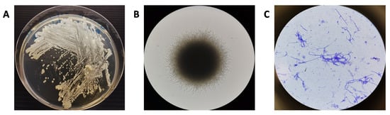 Visual images of the strain Actinomadura sp. (A) Macroscopic plate image. (B) Colony morphology on agar plate (100× magnification). (C) Cell morphology by Gram stain on glass slide (1000× magnification).
