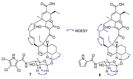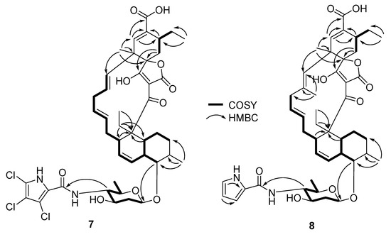 Compound 8, white amorphous powders, had a molecular formula of C45H58N2O10 assigned based on (–)-HRESIMS data. Comparison of 1H NMR data of 8 with those of 7 showed an additional singlet methyl at δH 1.79 and three additional proton resonances at δH 6.16, 6.82, and 6.90, characteristic 1H resonances of a pyrrole moiety (Table 1). The additional methyl was positioned at C-18 based on HMBC correlations from δH 1.79 to C-17, C-18, and C-19 (Figure 4). The other features of 1H and 13C of 8 were similar to those of decatromicin A (1). Based on these observations, compound 8 was a dechlorinated version of decatromicin A (1). The relative configurations of 8 were deemed to be the same as in 7 following analyses of J-coupling and NOESY data (Figure 6). Thus, the structure of 8 was assigned and named decatromicin C. It is worth mentioning that compound 8 was previously obtained from a dechlorination reaction of 1 using tri-n-butylstannane [14]. However, spectroscopic data of 8 was not reported. We have also included HRMS and full NMR spectroscopic data of 8, which were not reported in the original paper. This is the first report of the identification of 8 from a natural source.