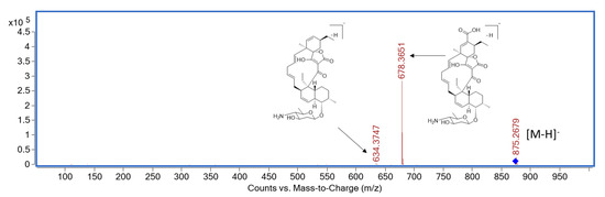 Interestingly, a replacement of the carboxylic acid group on the C-22 position in the aglycone moiety in compound 9 with a methyl group in compound 10 led to antibacterial activity against S. aureus Rosenbach as shown in Table 3 and Figure 9 (i.e., 9: MIC90 > 100 µM; 10: MIC90 of 17.5 µM). This could be due to the poor cell membrane permeability of the carboxylic acid group, thus resulting in no antibacterial activity in compound 9.