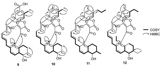 Compound 10, white amorphous powders, was assigned the molecular formula C34H46O5. The 1H and 13C NMR spectra of 10 were almost identical to those of 9, indicating that compound 10 had the same spirotetronate aglycone core structure. 1H NMR data showed that compound 10 had an extra methyl compared to 9 (Table 2). The 13C carbonyl NMR resonance at δC 171.4 in 9 was not observed in 10, suggesting that the carboxylic acid group in 9 was replaced by a methyl group. This was supported by HMBC correlations from the singlet methyl at δH 1.79 to C-21, C-22, and C-23 (Figure 7). The same relative configuration previously assigned for 9 was also determined for 10 following analyses of the NOESY data and 1H-1H coupling constants (Figure 8). Thus, the structure of 10 was established and named decatromicin E.