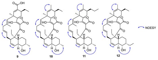 Compound 9 had a molecular formula of C34H44O7 following HRMS data analysis. 1H and 13C NMR spectra of 9 were similar to those of 8. However, the 1H NMR signals for the pyrrole group and amino sugar in 8 were missing in 9 (Table 2). Furthermore, the 1H NMR resonance of H-9 was shifted downfield from δH 3.39 in 8 to δH 3.41 in 9. Detailed 2D NMR (Figure 7) data analysis indicated that 9 was the aglycone core of 8, and named decatromicin D. The relative configuration of 9 was deemed to be identical as 8 following NOESY data interpretation (Figure 8). Previously, aglycone 9 was obtained from a degradation study of decatromicin A (1) [14]. Here, we report the isolation and identification of 9 from a natural source.