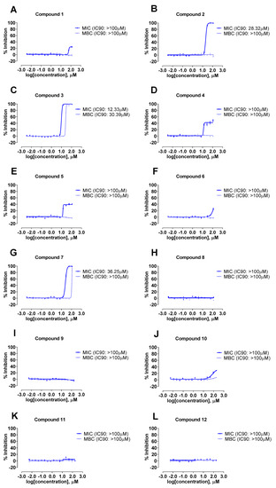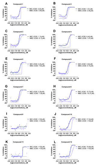 Inhibitory effect dose–response curve against S. aureus Rosenbach (ATCC® 25923™) for compounds 1–12 (A–L).
