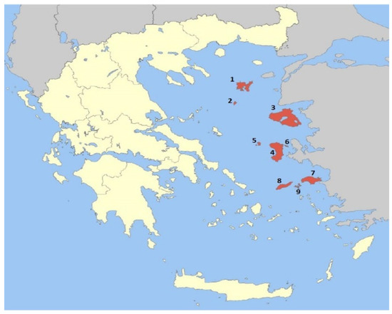 The northeast Aegean islands: 1. Lemnos, 2. Agios Efstratios, 3. Lesvos, 4. Chios, 5. Psara, 6. Oinousses, 7. Samos, 8. Ikaria, 9. Fourni. https://en.wikipedia.org/wiki/North_Aegean#/media/File:Vorio_Egeo_in_Greece.svg (17 October 2022).