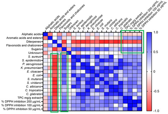 Propolis samples’ chemical content correlates with antimicrobial activity, TPC and DPPH inhibition activity. Red and blue colors represent negative and positive Spearman’s rank correlation coefficients, respectively. Only p < 0.05 correlations (green highlight) were taken into consideration.