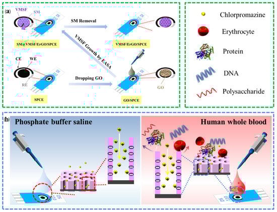 Schematic illustration for the preparation of VMSF/ErGO/SPCE (a) and the electrochemical detection of CPZ in PBS and human whole blood samples (b).