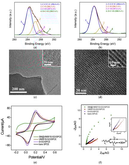 Carbon 1s XPS profiles of GO/SPCE (a) and ErGO/SPCE (b). Top-view (c) and cross-sectional view (d) TEM images of VMSF. The insets are the corresponding TEM images with high magnification. CV (e) and EIS (f) plots of the bare SPCE, ErGO/SPCE, VMSF/ErGO/SPCE, and SM@VMSF/ErGO/SPCE in 0.1 M KCl solution containing 2.5 mM Fe(CN)63–/4–. Insets in (f) are amplified plots of bare SPCE and ErGO/SPCE, and the fitting equivalent circuit diagram. In addition, Rct, Rs, W, and C denote the charge-transfer resistance, uncompensated solution resistance, mass-transport-related Warburg element, and capacitance of ErGO/solution interface, respectively.