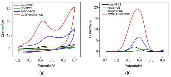(a) CV and (b) DPV curves of bare SPCE (black), GO/SPCE (green), ErGO/SPCE (blue), and VMSF/ErGO/SPCE (red) in 0.1 M PBS solution (pH 6.0) containing 20 μM CPZ. The scan rate in (a) is 100 mV/s.