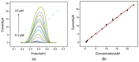 (a) DPV curves of VMSF/ErGO/SPCE in 0.1 M PBS solution (pH 6.0) containing various concentrations of CPZ (from bottom to up: 0.3, 0.5, 0.8, 1, 3, 5, 8, 10, 13, 15, 17, 20, and 23 μM). (b) The corresponding calibration curve and the error bars represent the standard deviation (SD) of three measurements.