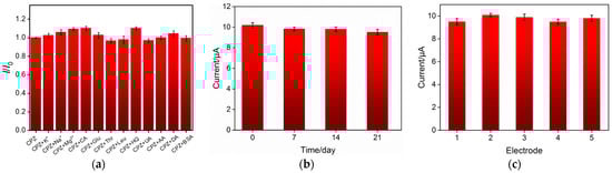 (a) The current ratio (I/I0) obtained from VMSF/ErGO/SPCE for detection of 20 μM CPZ in the presence (I) and absence (I0) of added interfering species. The concentration of BSA is 6 μM and the concentration of other interfering species is 1 mM. Stability (b) and reproducibility (c) of sensors. The error bars represent the SD of three measurements.