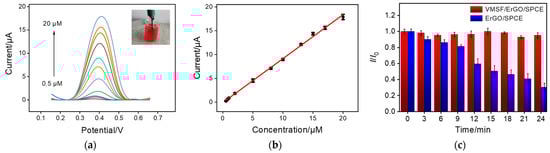 Several performance parameters are vital for evaluation of electrochemical sensors, such as anti-interference, stability, and reproducibility. As shown in Figure 5a, interfering substances, including K+, Na+, Mg2+, citric acid (CA), glucose (Glu), threonine (Thr), leucine (Leu), hydroquinone (HQ), ascorbic acid (AA), uric acid (UA), 3-hydroxytyramine hydrochloride (DA), and bovine serum albumin (BSA), were used to examine the anti-interference ability of VMSF/ErGO/SPCE. The presence of interfering substances has not caused significant influence on the detection of CPZ, indicating excellent anti-interference ability. After three-week storage, VMSF/ErGO/SPCE still remains 93.4% of its initial measured value, showing good stability (Figure 5b). Five different VMSF/ErGO/SPCE were prepared using the same procedure and used to detect CPZ, respectively. The obtained relative standard deviation (RSD) from five electrodes is 2.8%, suggesting excellent reproducibility of the proposed sensor (Figure 5c). However, owing to the inherent property of VMSF, the developed VMSF/ErGO/SPCE could not possess long-term stability in strong alkaline solutions.