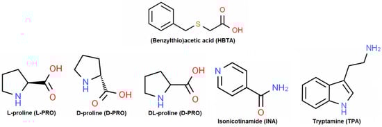 Figure 1. The chemical diagrams of the (benzylthio)acetic acid (HBTA) and selected N-containing co-formers.