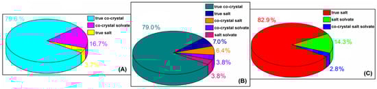 Figure 2. The percentage distribution of the reported forms of carboxylic acid:PRO; (A) carboxylic acid: INA; (B) and carboxylic acid: TPA (C) supramolecular associations [21,22].
